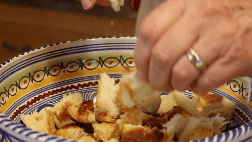 - In a separate bowl, tear the toasted bread into bite-sized pieces.