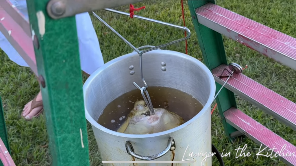 ⚠️ make sure to follow safety precautions when deep frying a turkey to prevent it from blowing up or dangerously causing a fire. keep a fire extinguisher nearby in case a fire does occur.