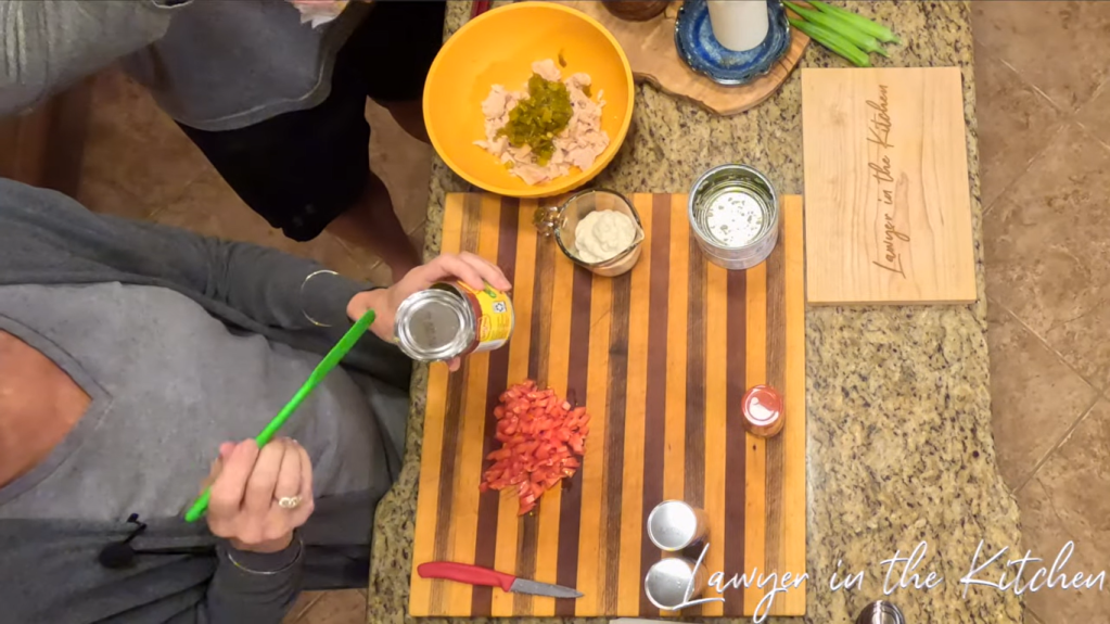 - dump green chilies, shredded cheese. Southwestern seasoning, mayonnaise, and tomatoes into the bowl and stir