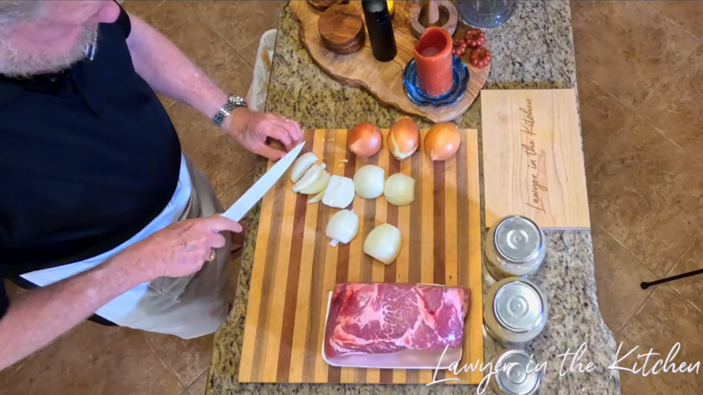 - remove the tops and bottoms of 3 onions, then peel and chop them