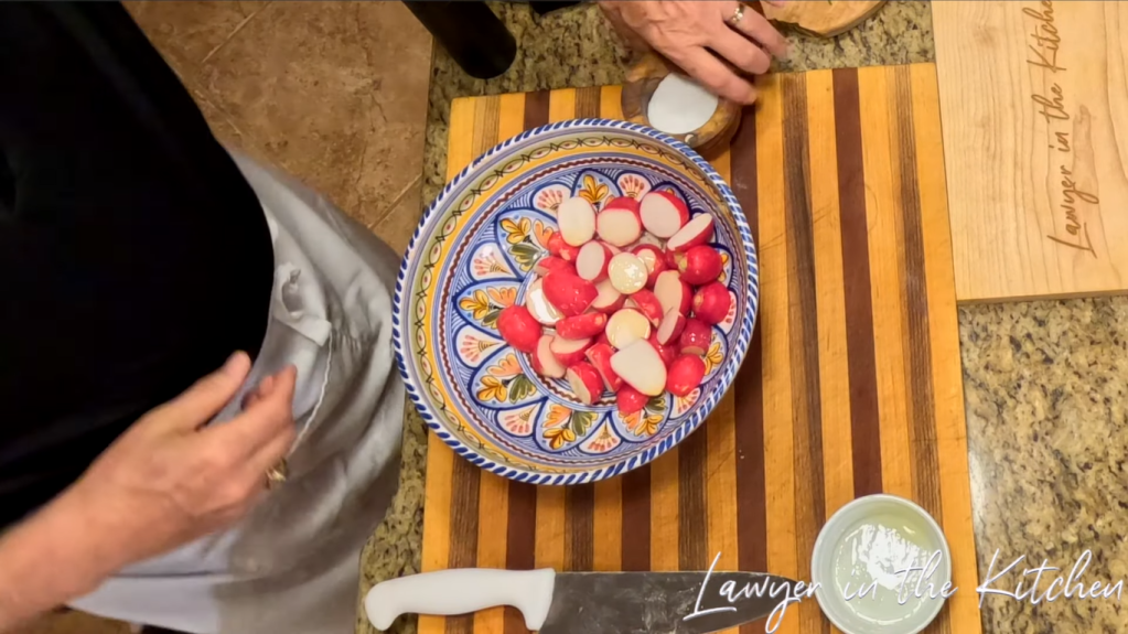- remove the roots of the radishes and chop them, putting them into a large bowl