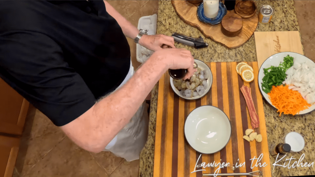 - put soy sauce, oyster sauce, and sesame oil in a bowl full of shrimp and mix