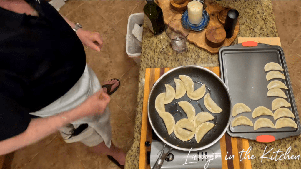 - put oil onto a pan on the heated stove and add the potstickers in, flat side down