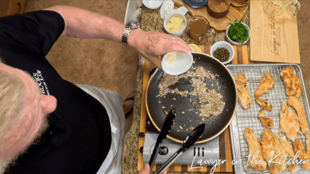 - coat the chicken with flour and set it on a wire rack on top of a sheet pan, then set aside