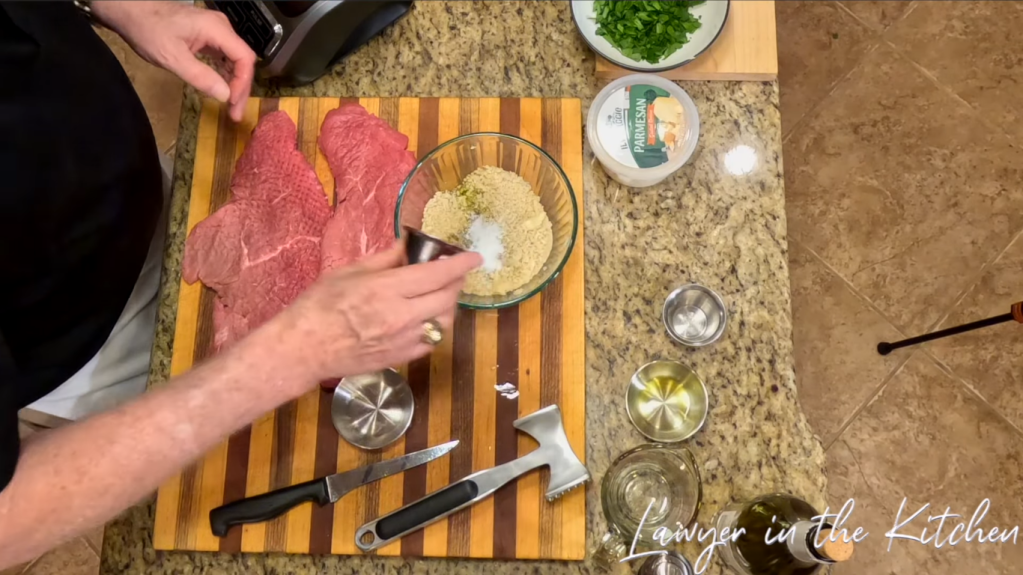 - cover the meat with a thick sheet of plastic (you can use a Ziploc bag for this) and pound the meat to make it about 1/4 inch thick
