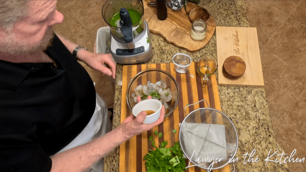 - pour a little bit of the cilantro oil (about 1/4 of it) into the shrimp, saving most of it for later