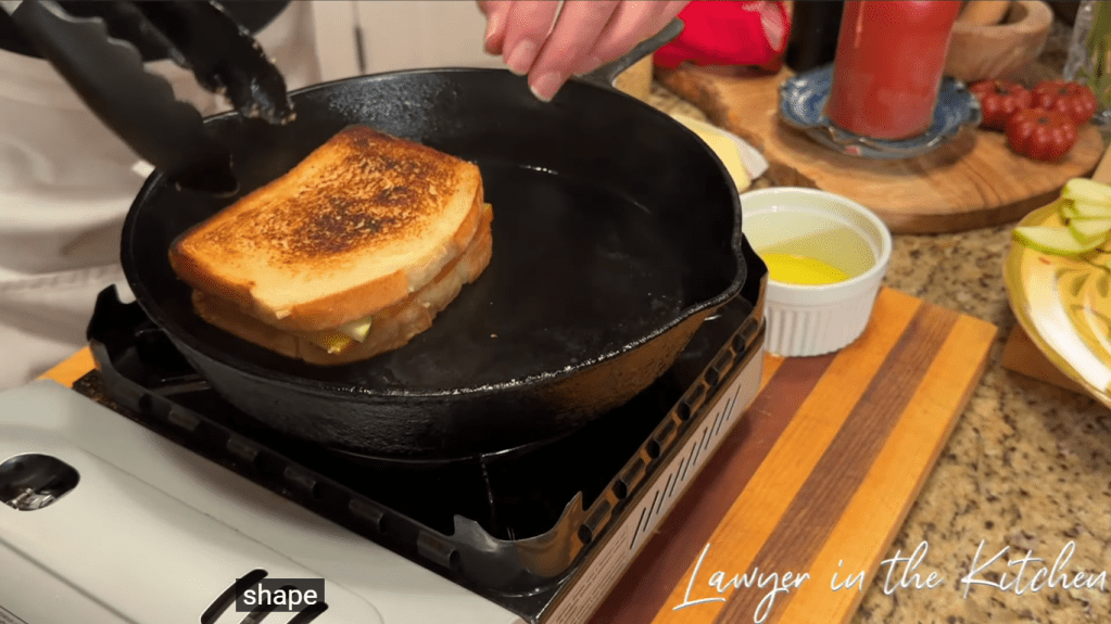 - spread melted butter onto both slices of bread and onto the pan