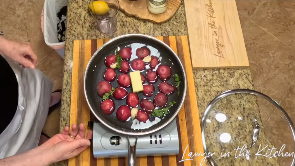 - put a lid on the pan and turn down the heat to medium, letting the potatoes cook for 15 minutes