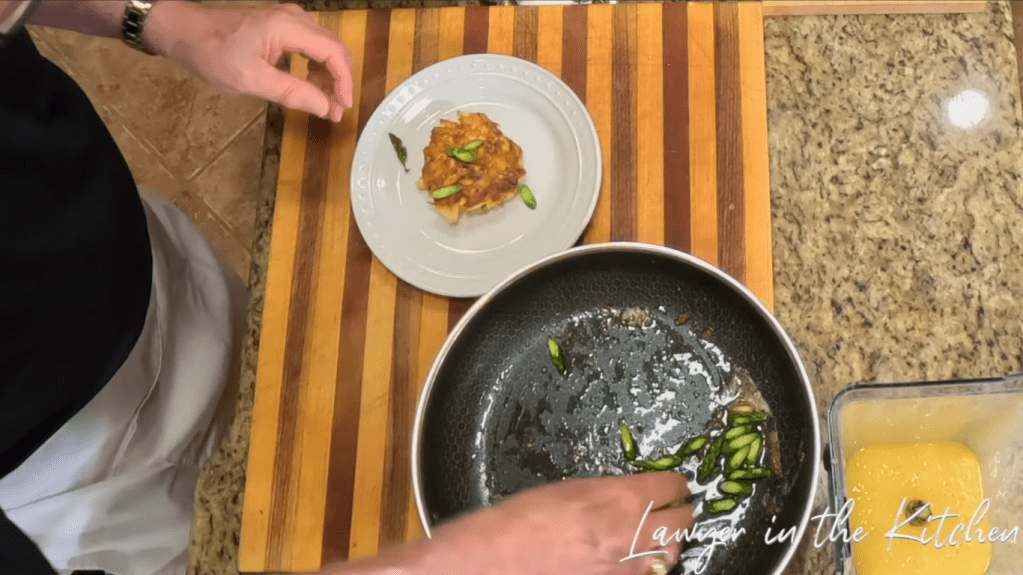 - serve a crab cake on a plate, top it with some asparagus, and drizzle it with the Hollandaise sauce before you enjoy!