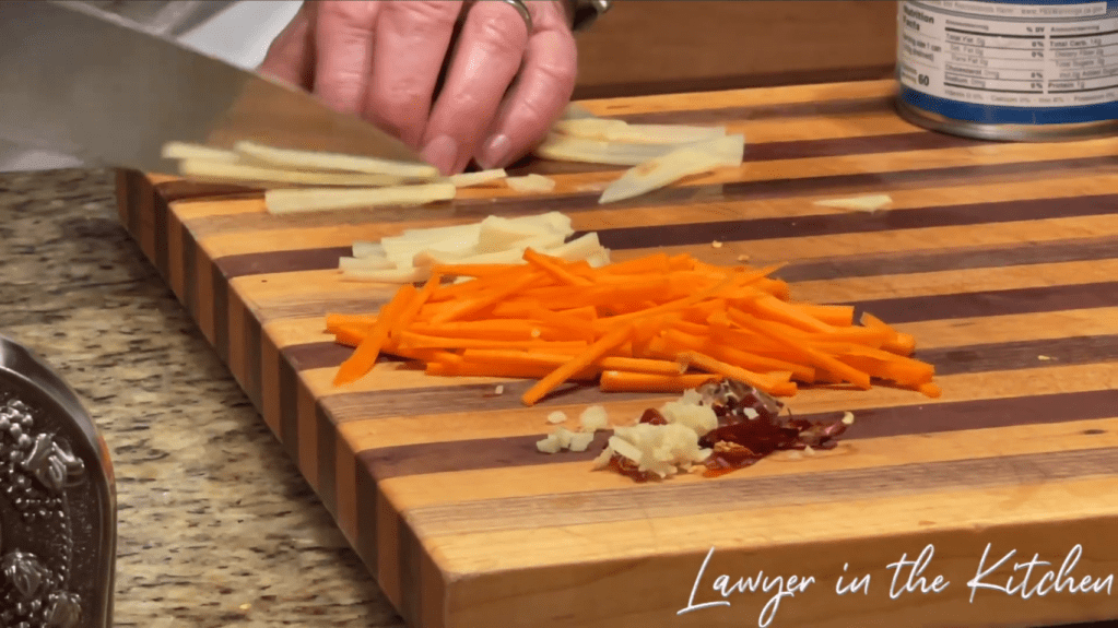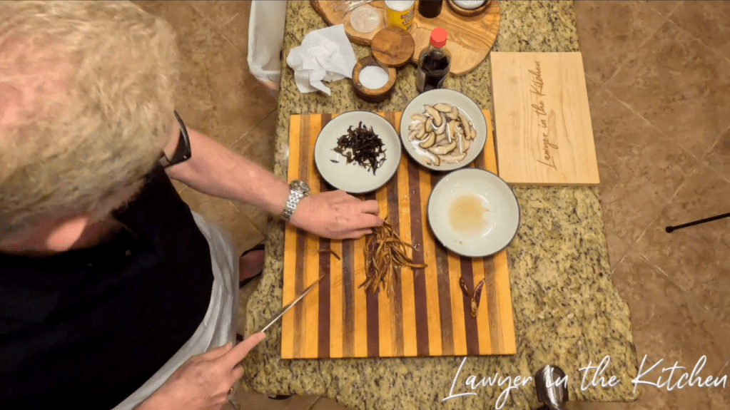 - cut the soaked shitake mushrooms nice and thin and soak them in water again