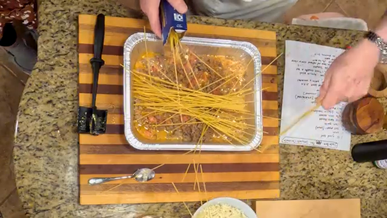 - cover with tinfoil and cook in the oven for 35-40 minutes at 350°F or until spaghetti is done