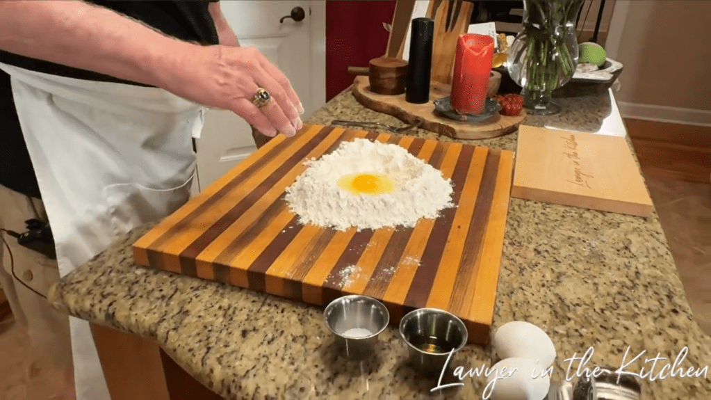 - pour the flour onto a cooking board a form a volcano shape