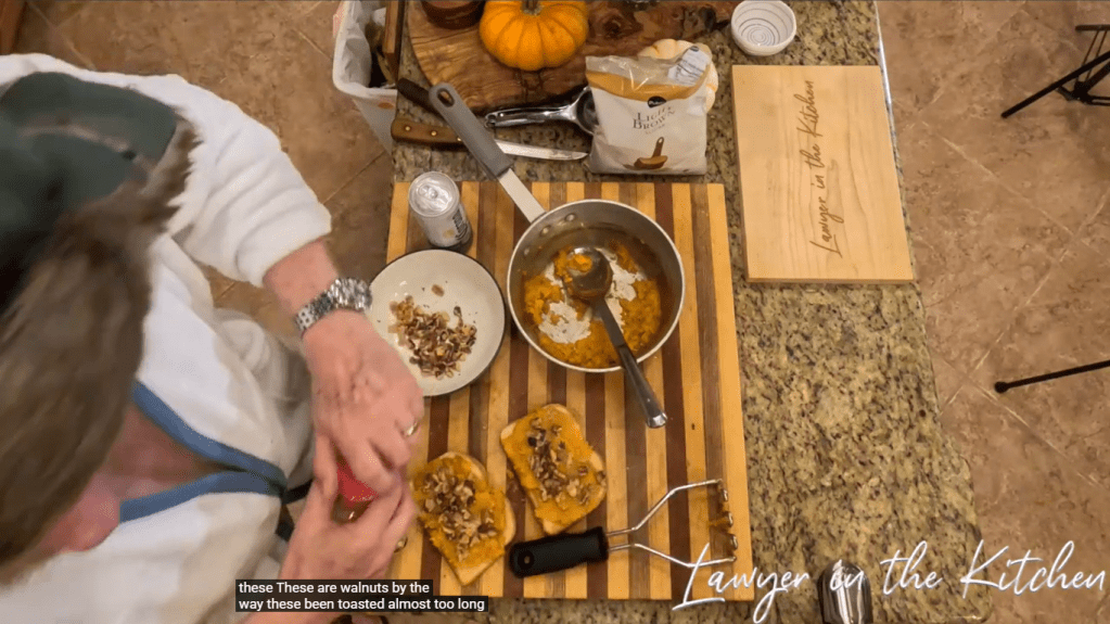 - put some brown sugar, walnuts, and cinnamon on each slice of toast