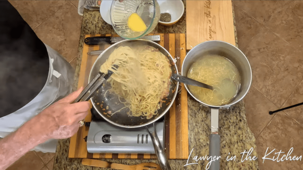 - add the pasta to the pan and add 1/2 ladles of pasta water