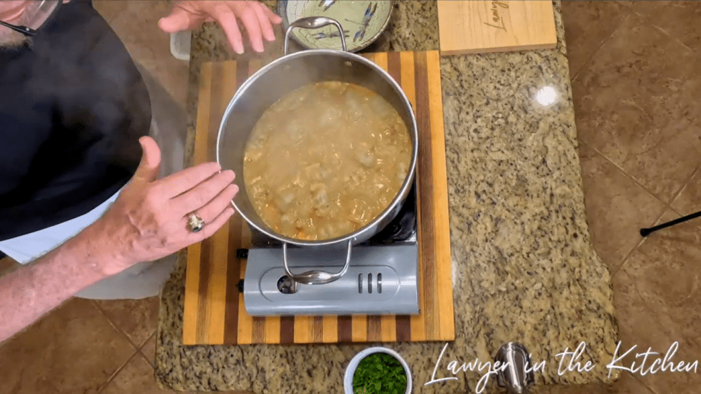 - pour in the chicken broth and the coconut milk, stir them, then simmer for 5 minutes