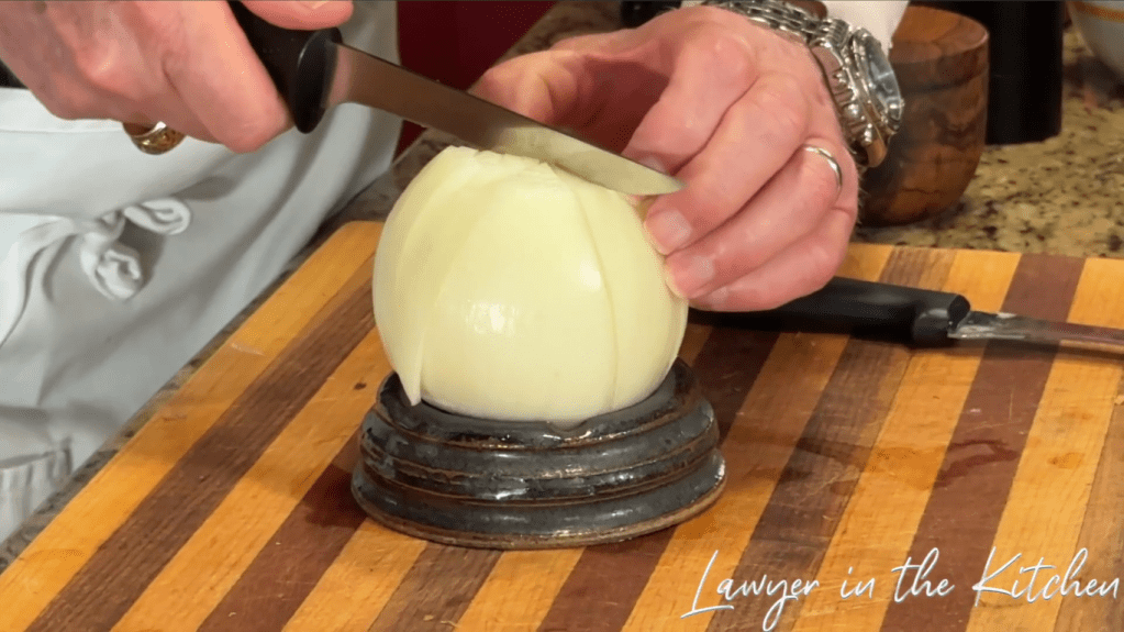 - place the top of the onion into a big lid and using a smooth, thin knife, vertically cut the onion in half several times
