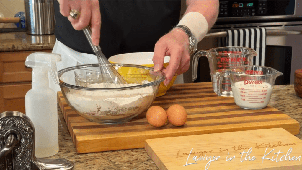 - put in 2 eggs, water, and milk in a different bowl and stir well with a whisk