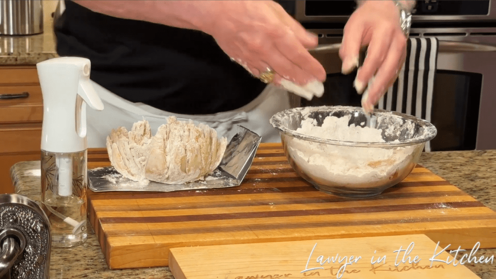 - put the onion right-side up into a large bowl of dry ingredients and use a spoon or your fingers to get the flour in between all the petals