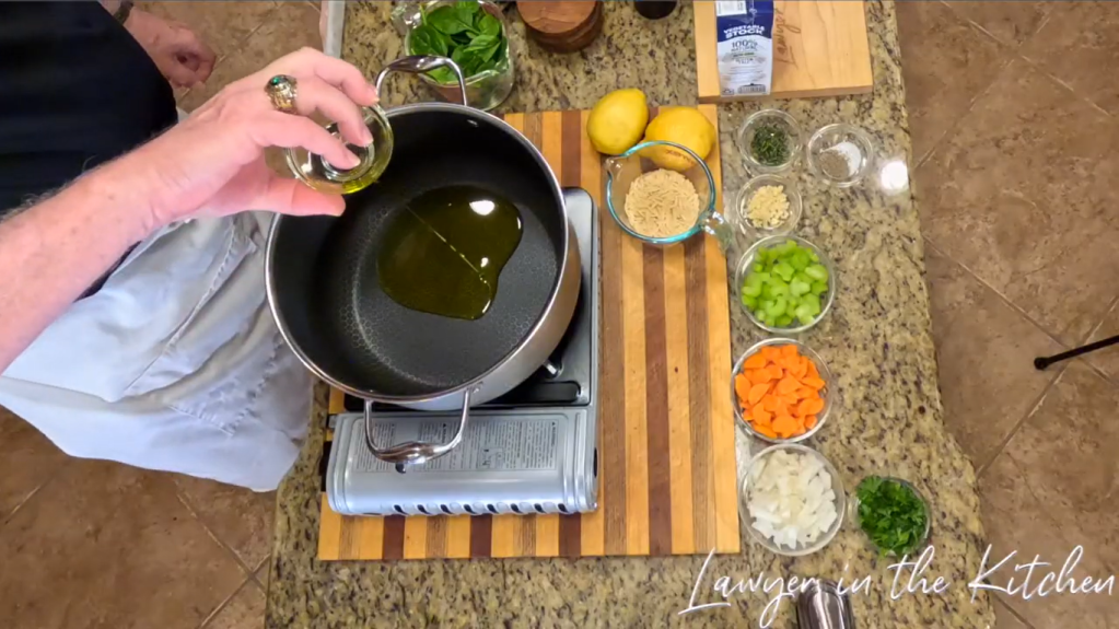 - heat a sauce pan on a stove and put in the olive oil, onion, carrots, and the celery, then stir