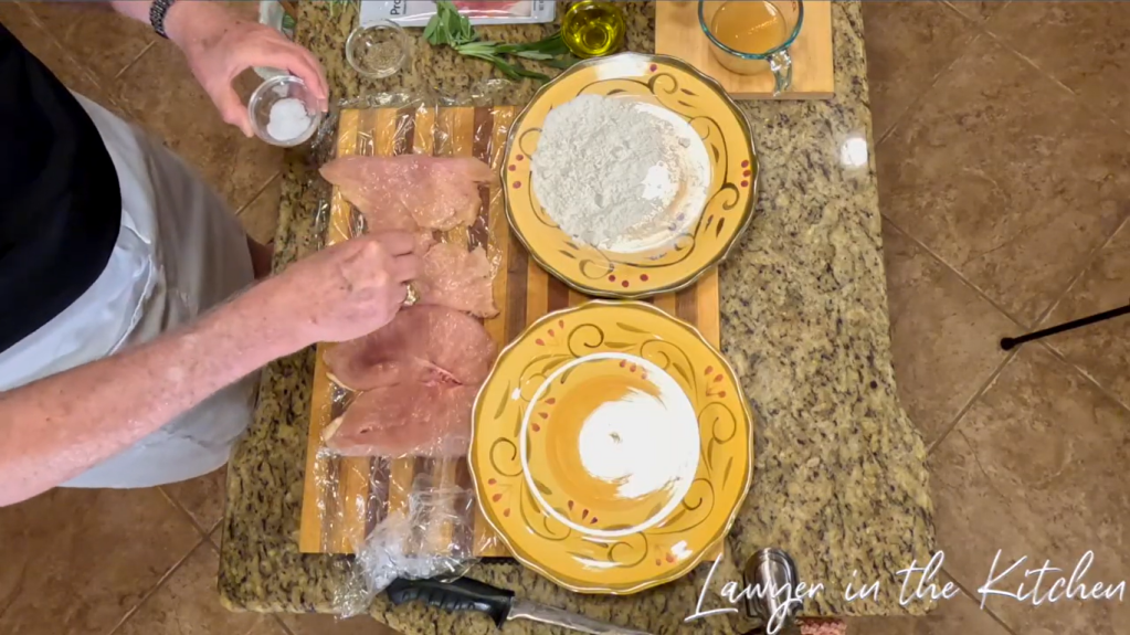 - Pinch the chicken and prosciutto together while dredging them lightly in flour. Repeat for each cutlet