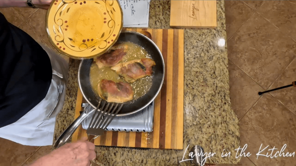 - Carefully place in the chicken, making sure the prosciutto stays on nicely and the 2 leaves remain between each piece of chicken and prosciutto